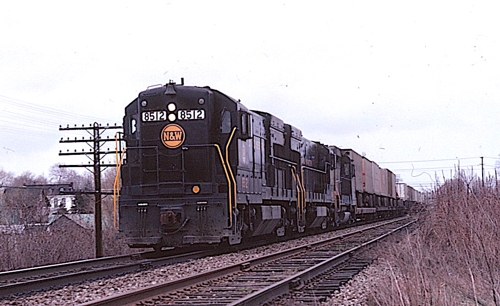 A few miles outside of Erie, we encountered a westbound Norfolk & Western hotshot with several piggybacks up front. GE-built U30B 8512 (c/n 37490, b/d 1/71) was in command. |
