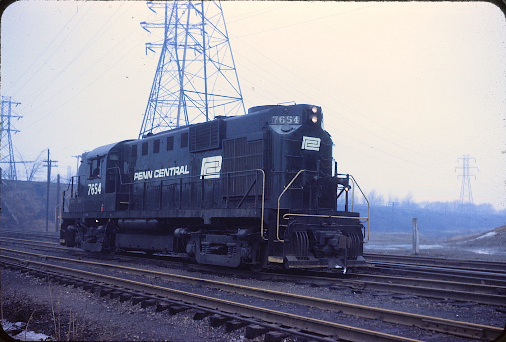 Rare Alco RS11 7654 (at least on the west side of the PC system) was seen backing down an outbound track to collect cars for a local being assembled in the yard. (Ex-PRR 8654 c/n 82829, b/d 12/57) |