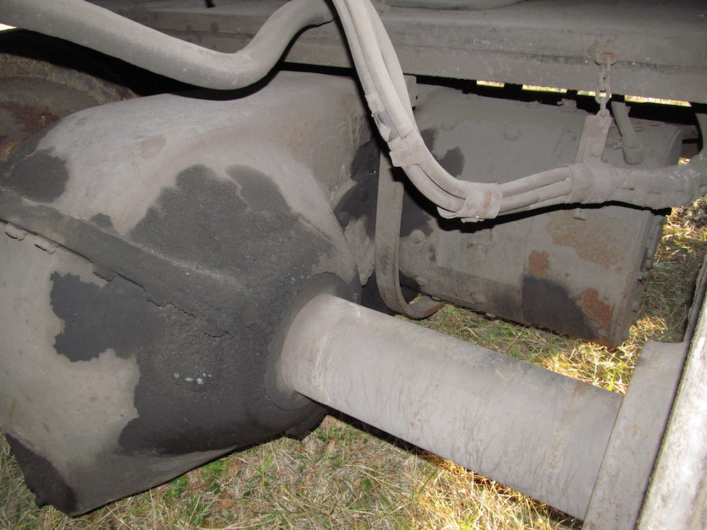 Let's contrast that scene to today and envision a shop mechanic (or museum volunteer for that matter) attempting to fix the heavy-duty chain which helps drive a 45 or 50-ton locomotive. On early GE 45/50 industrial switchers, the trailing axle on a truck was driven by a side-rod that connected to the front axle which was driven by a traction motor. GE eliminated the side-rods on later models in favor of a chain drive built within the truck to achieve the same result. A few photos from the underside of a so-called "critter" helps illustrate the complex nature of the work. The photos here depict the undercarriage commonly found on a General Electric 45/50-ton locomotive. In this case, its ex-Ohio Edison GE 50-tonner recently donated to the Beaver/ Lawrence Historical society located in West Pittsburg, Pennsylvania. Donated by the public utility company, the four-axle GE was built in February 1957 (s/n 32849). Volunteers have been busy restoring the pint-size locomotive to operating condition.