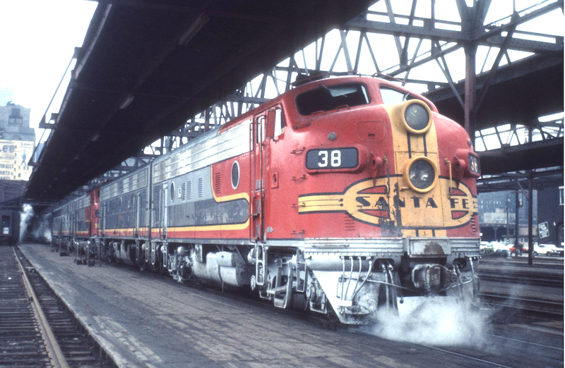 (Left photo) Santa Fe F7 38L prepares to lead Train 1 the San Francisco Chief on April