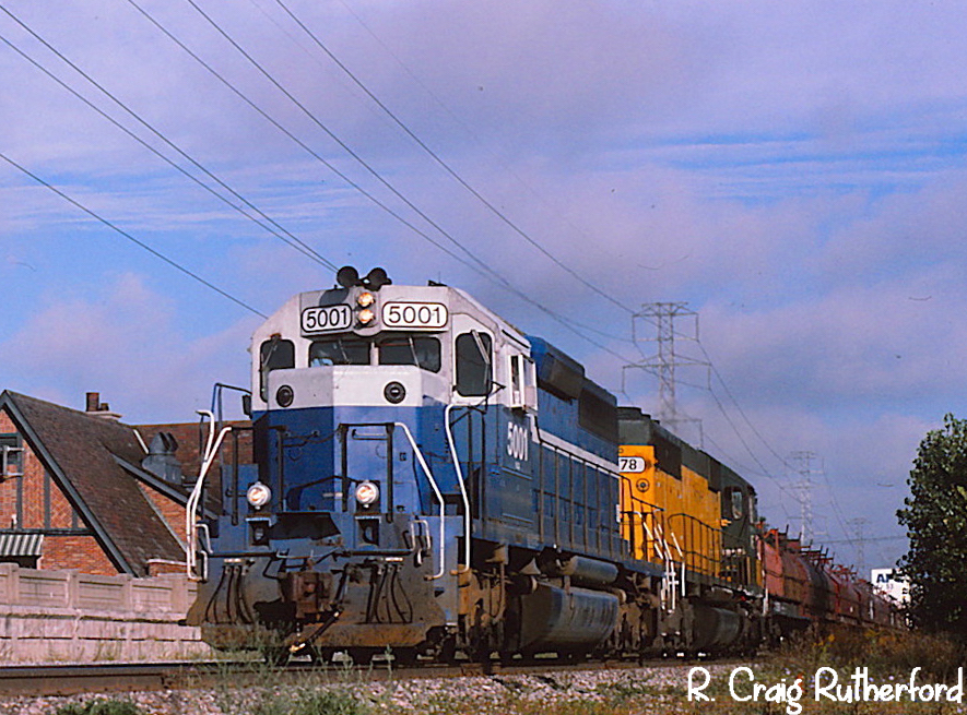 ![]() Helm SD40 #5001 at historic Birmingham (MI) station on GTW iron in September 1984. (R. Craig photo) |