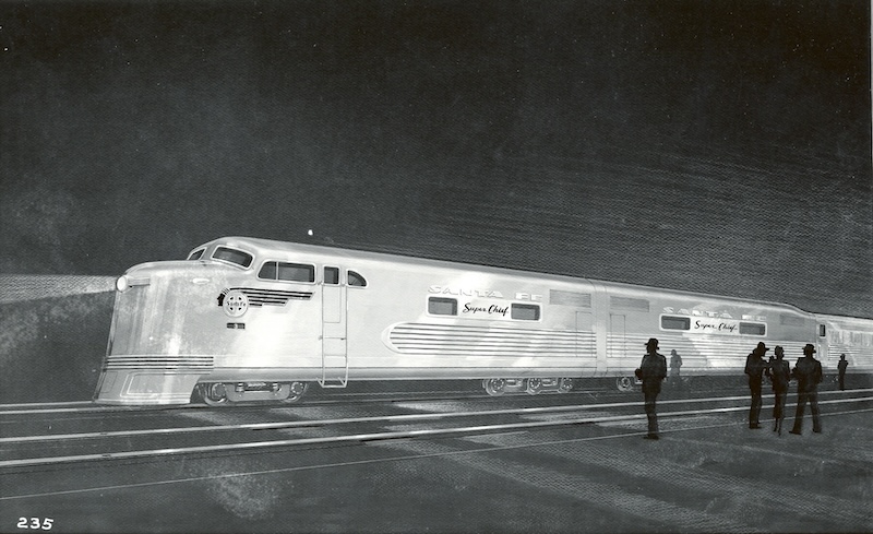 Prior to Atchison Topeka & Santa Fe's introduction of its new classy "Super Chief" service they sought a streamlined diesel on the point. Several concepts were explored prior to Leland Knickerbocker's design of the above E-unit. The slant nose and iconic "War Bonnet" attire were dynamic refinements later added by the artist. (Greg Palumbo collection)