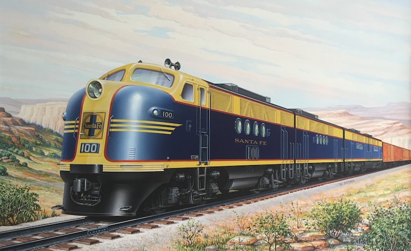 Atchison Topeka & Santa Fe's popular freight attire from the 1940s was its best when applied to the bulldog nose of EMD-cab units. Artist Ben Dedek showcases the railroad's first diesel-powered freight cab set in classic A/B/B/A configuration rolling across the grasslands of eastern Texas with ATSF FT #100 on the point. (Greg Palumbo collection)