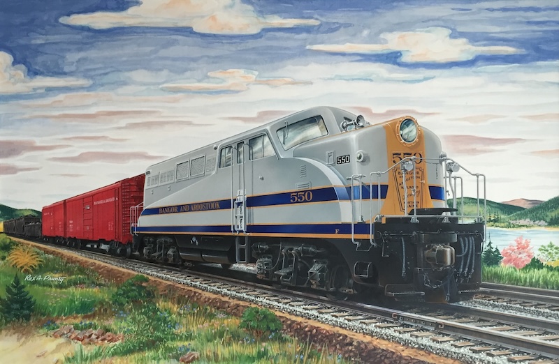 A rare Bangor & Aroostook BL2 is portrayed in this Rex Prunty illustration. A member of the EMD Styling Group, his work bears a strong resemblance to that of Ben Dedek; the biggest difference perhaps is that his name gets little recognition. (Greg Palumbo collection)