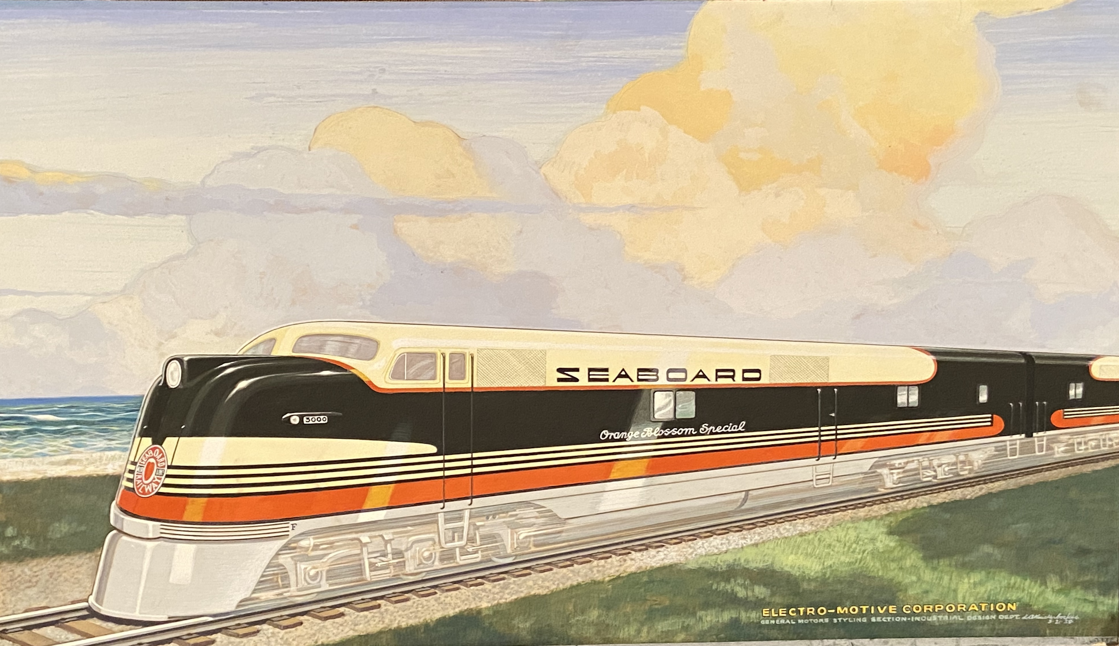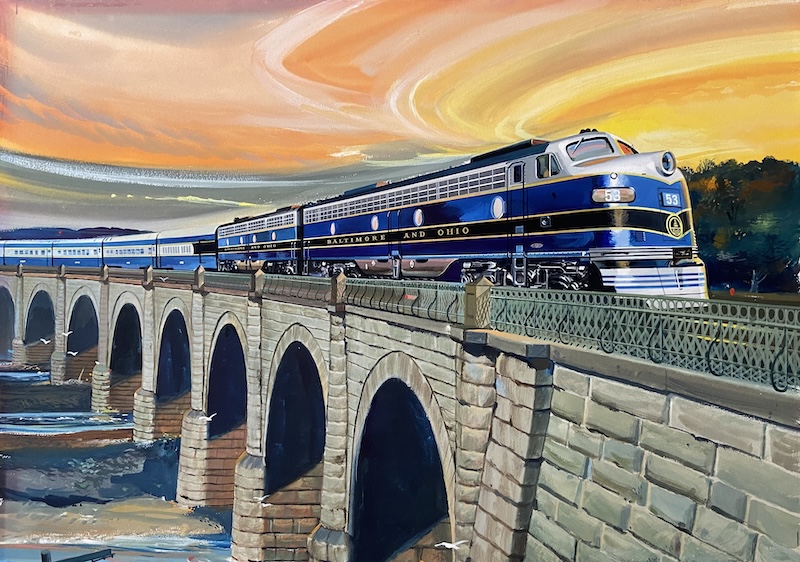 Kudner Advertising Agency was retained occasionally by EMD to handle overflow assignments and projects requiring a quick turn-around, such as this painting by the Agency's Rick Handville of E8As leading the "Cap" out of Washington D.C. (Greg Palumbo collection)