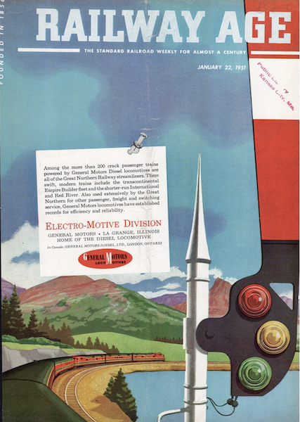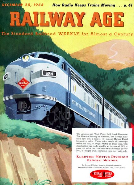 General Motors, the consumate marketer, often purchased the cover space of Railway Age magazine to announce recent new locomotive buyers, such as the Atlanta & West Point. (Detroit Public Library Archive)