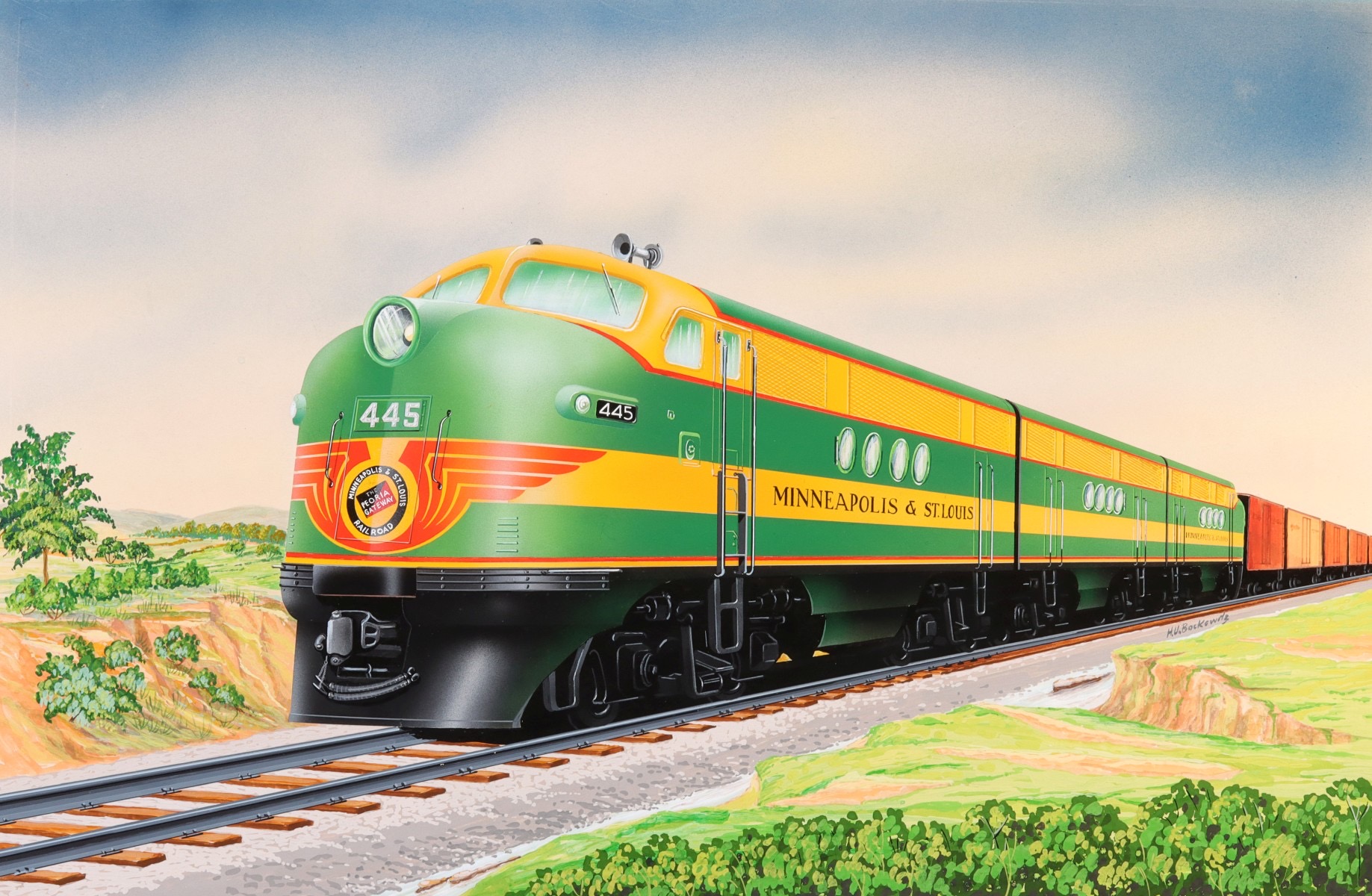 Too few color photographs exist of the Minneapolis & St. Louis railroad's small fleet of FTAs (four A-Units) & FTSBs (two B-units) built during the final year of WWII. This Harry Bockewitz artwork of FTA/B/A #445 rolling across agricultural farmland in the midwest is a worthwhile substitute and reminder. (Streamliner Memories Website)