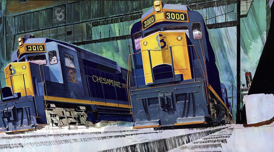 Chesapeake & Ohio's 48 new EMD GP30s arrived during 1962/63. Tom Fawell's rendering places several of the newcomers in an industrial setting to reflect the model's multiple uses. (Trains Magazine Archives)