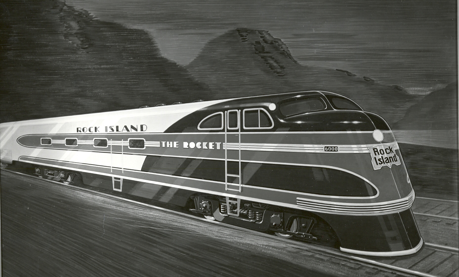 Here is another crisp Leland Knickerbocker illustration; he created this one while still at the General Motors Styling Section in Detroit, Michigan. Developed for the Chicago Rock Island & Pacific, the proposed E-unit's slanted nose conveys a sense of modern styling and speed. (Greg Palumbo collection)