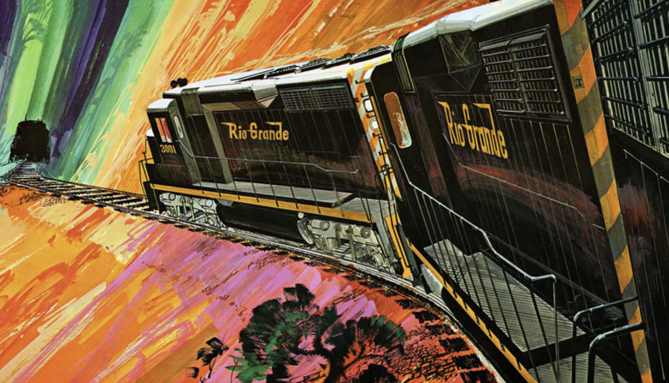 A trio of four-axle Denver & Rio Grande Western F7s roll through Colorado's Royal Gorge in this Bern Hill depiction from the early 1970s. (Detroit Public Library Archive)