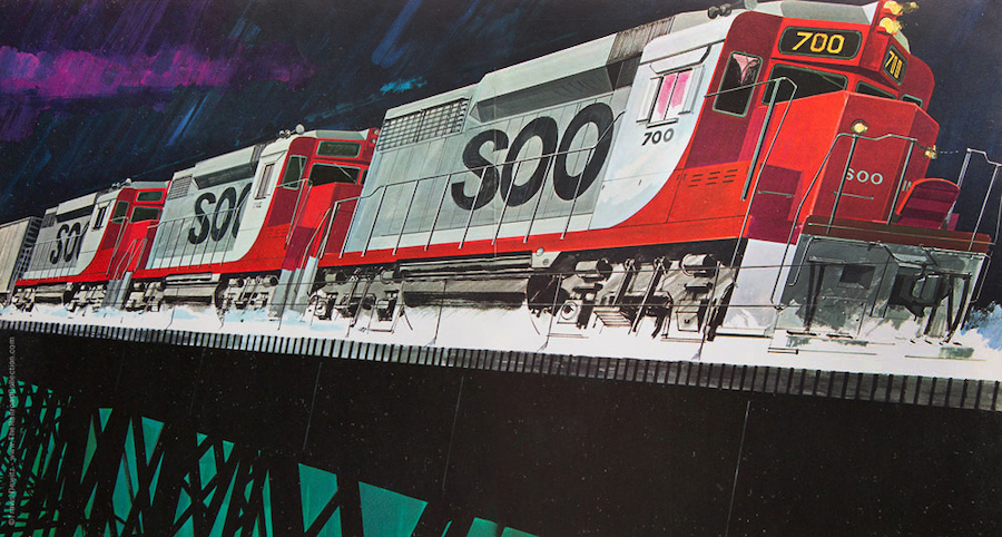 SOO Line purchased 22 EMD-built GP30s in 1962; they sported the company's new look. Tom Fawell artistically shows three of them high above the St. Croix River. (Deane Motis collection)
