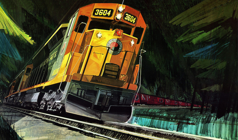 The artistry of Tom Fawell has a trio of Northern Pacific SD45s with a high-priority freight conquering the Rocky mountains. (Ralph Back collection)