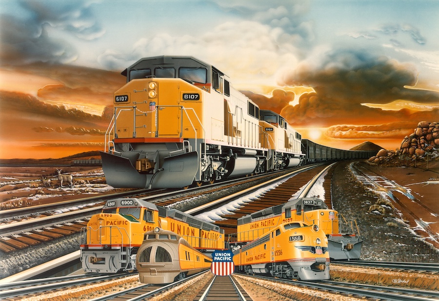 EMD's staff Artist John Jordal created this dynamic montage of Union Pacific power. The original artwork, which shows a SD60 team conquering Sherman Hill in Wyoming and a small cluster of early and late mode EMDs position below, was presented to Union Pacific management. (Greg Palumbo collection)