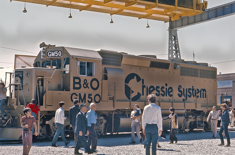 ![]() For decades, the Marquee on the front lawn at EMD stood for wonderment and excitement, but on September 21 1972, it also meant "welcome." (Bill Howes photo) | ![]() B&O #50 was the first diesel locomotive built specifically to haul non-articulated passenger trains. The 1800-hp model AA was delivered by Electro-Motive Corporation in August 1935. (Bill Howes photo) |