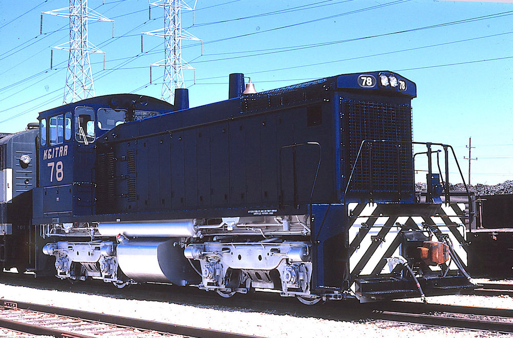 ![]() This freshly painted GP40-2 is headed back in to the shop for some important finish work, including the missing letter "i" from the word Chessie. (R. Craig photo) | ![]() Kentucky & Indiana Terminal SW1500 #78 ready for shipment waits behind the plant, while sister #77 stands in the exhibit area showing-off new silver flexicoil trucks. ( R. Craig photo) |