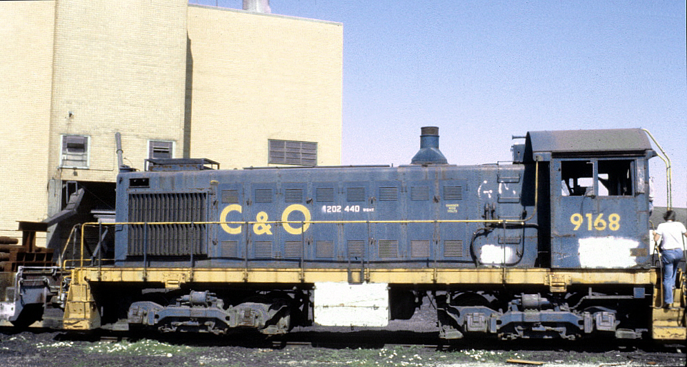 ![]() Two 1500-hp switchers in standard EMD attire are parked close to loco servicing facilities. One of them is MP15AC #115 built in 1975; the other is SW1500 #114. The nine original SW1500 demonstrators (#106-114) were sold to shortline or terminal railroad operators. The #115 was later sold to Georgetown RR. (Willaim Johnson photo) | ![]() Clearly one of the most unusual units available for the curious was a 40-year-old Alco-built S1 switcher, with Blunt trucks. Ex-Chesapeake & Ohio #9168 had been trade-in fodder years earlier on new locos. Reportedly, the old Alco's was used exclusively as a test-scale car. (Marty Bernard photo) |