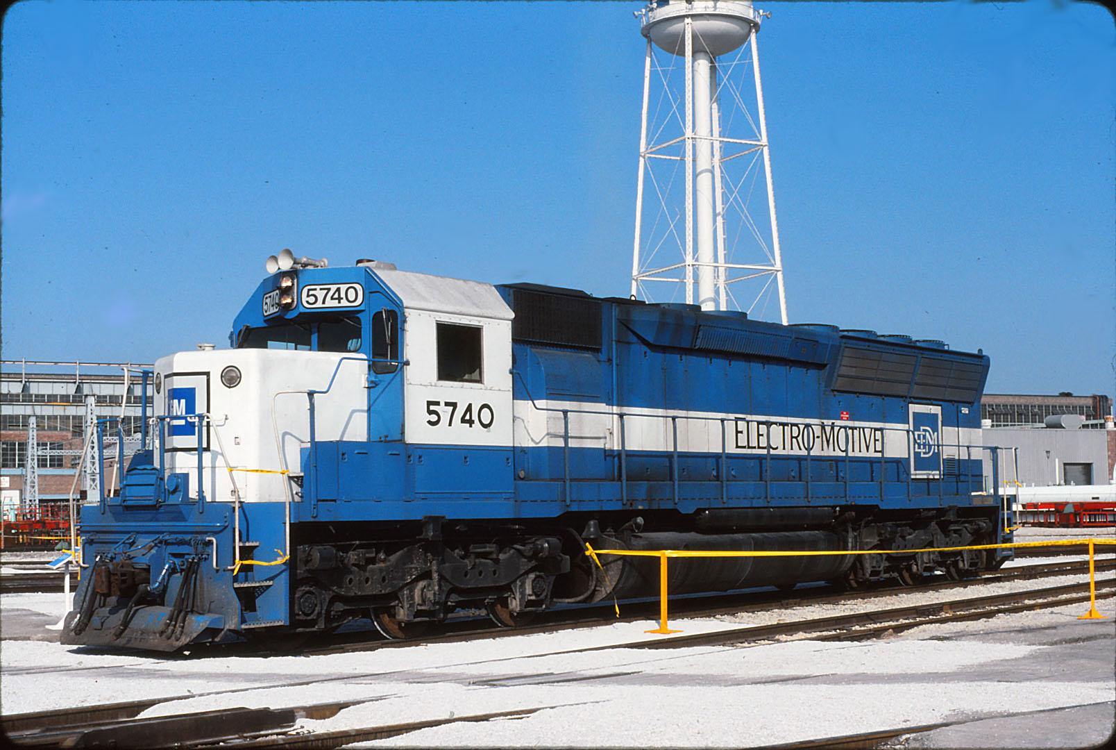 ![]() EML GP38-2 #837 was originally built for Penn Central as #8037 in 1972; it went to Conrail years later still wearing #8037. In 1987, it became the property of EMLX (the leasing arm of GM in the late 1980s. From there, the four-axle road-switcher went to UP in 1998 as #1968/ 468. It also spent time as an LLPX lease unit, prior to joining the lease fleet at GMTX. (R. Craig photo) | ![]() Through-out 1989 and 1990, the erection bays at the LaGraange plant were filled with SD60Ms, while EMD worked to complete Union Pacific's first order for the new 3800-hp road-switcher (#6085-6268). While the #6200 was outside basking in the sun, the shell of sister #6205 was inside the assembly hall being raised and lowered for visitors by a 200-ton capacity crane. (David Wilson photo) |