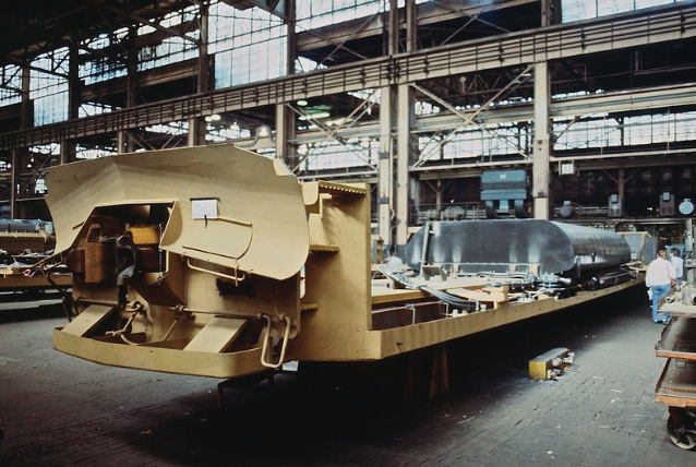 ![]() The locomotive Cab Assembly department routinely handles the fabrication of two-window spartan cabs that are installed on the frames of GP38-2s and GP40-2s, as well as three-windows safety cabs for SD60Ms. (Michael Metalis photo) | ![]() The physical beginning of a new locomotive takes place in the Frame department, where fuel tanks are installed, snow plows applied and couplers added along with required mechanical rigging. (Michael Metalis photo) |