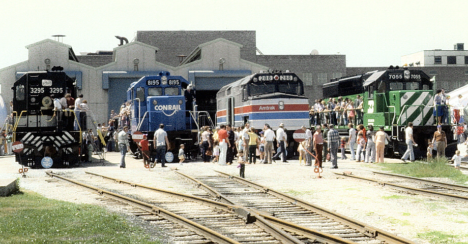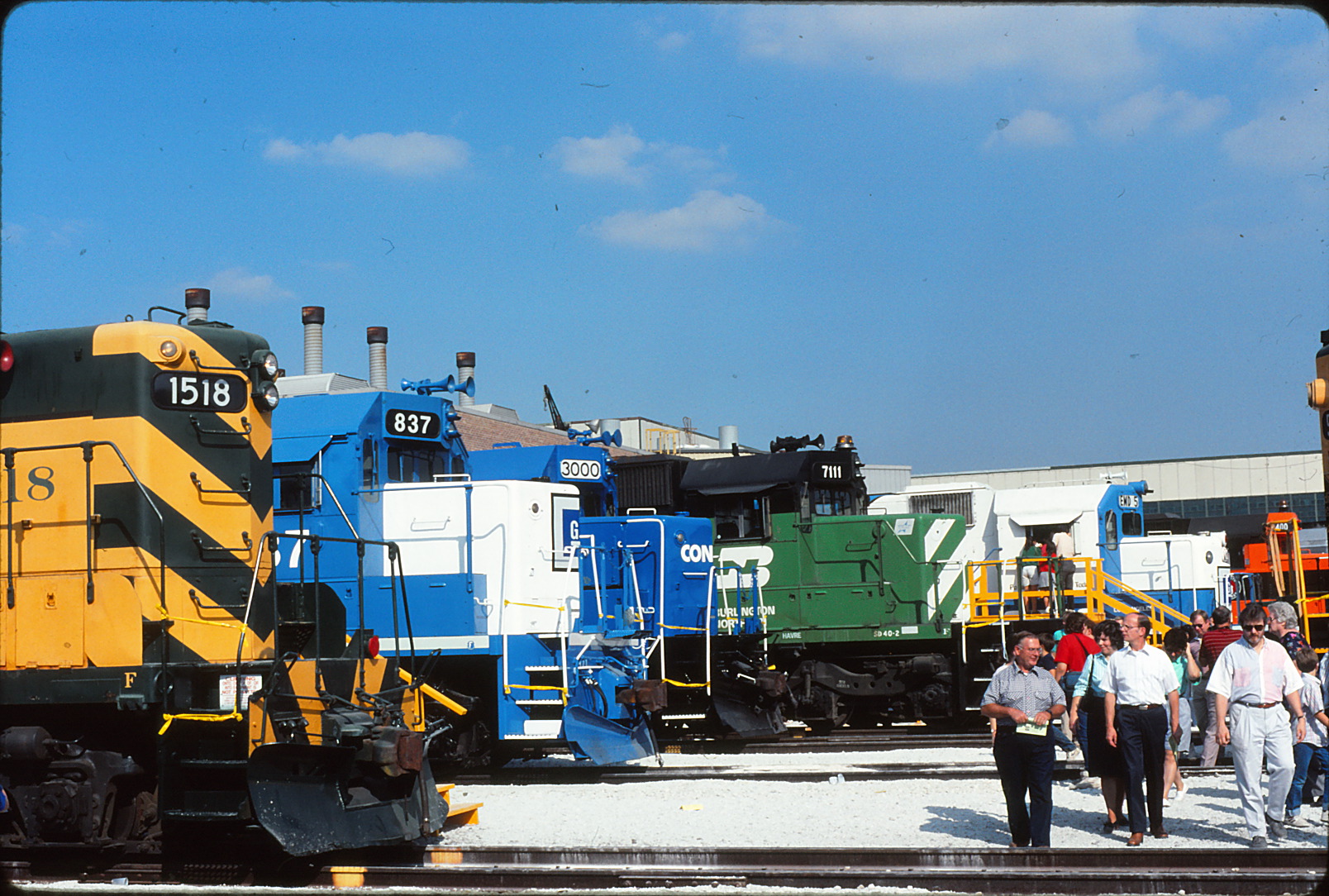 Held on 21 September 1989, EMD's 75th Anniversary celebration was for many a return to the past, a sentimental journey or a time warp. It was the most heavily advertised in advance and, not surprising, the best attended open house of all prior open events. As had been promised, EMD used the occasion to showcase several historic and notable locomotives from from the past, including the first FT 103 diesel freight unit. There were also present day locomotives, demonstrators, equipment exhibits, in-plant demonstrations, and even vintge movies. As might be expected, the railfan community turned-out in large numbers, and the sound of camera shutters reverberated throughout the plant complex. Let's pause and take a look back at both of 1978 and 1989 open houses. If you missed the first part of the this photo essay, here is a link to EMD Open Houses (Part 1).