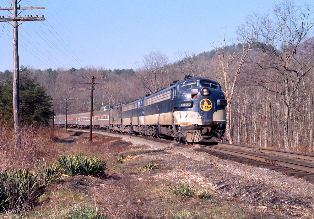 On 14 April 1973, two B&O E8s, a B&O GP7 and four cars charge uphill at Copeland, VA. E8s and last three cars break-off for Washington, D.C. The lone geep and dome aim for Newport News. (Stanley Short photo) |