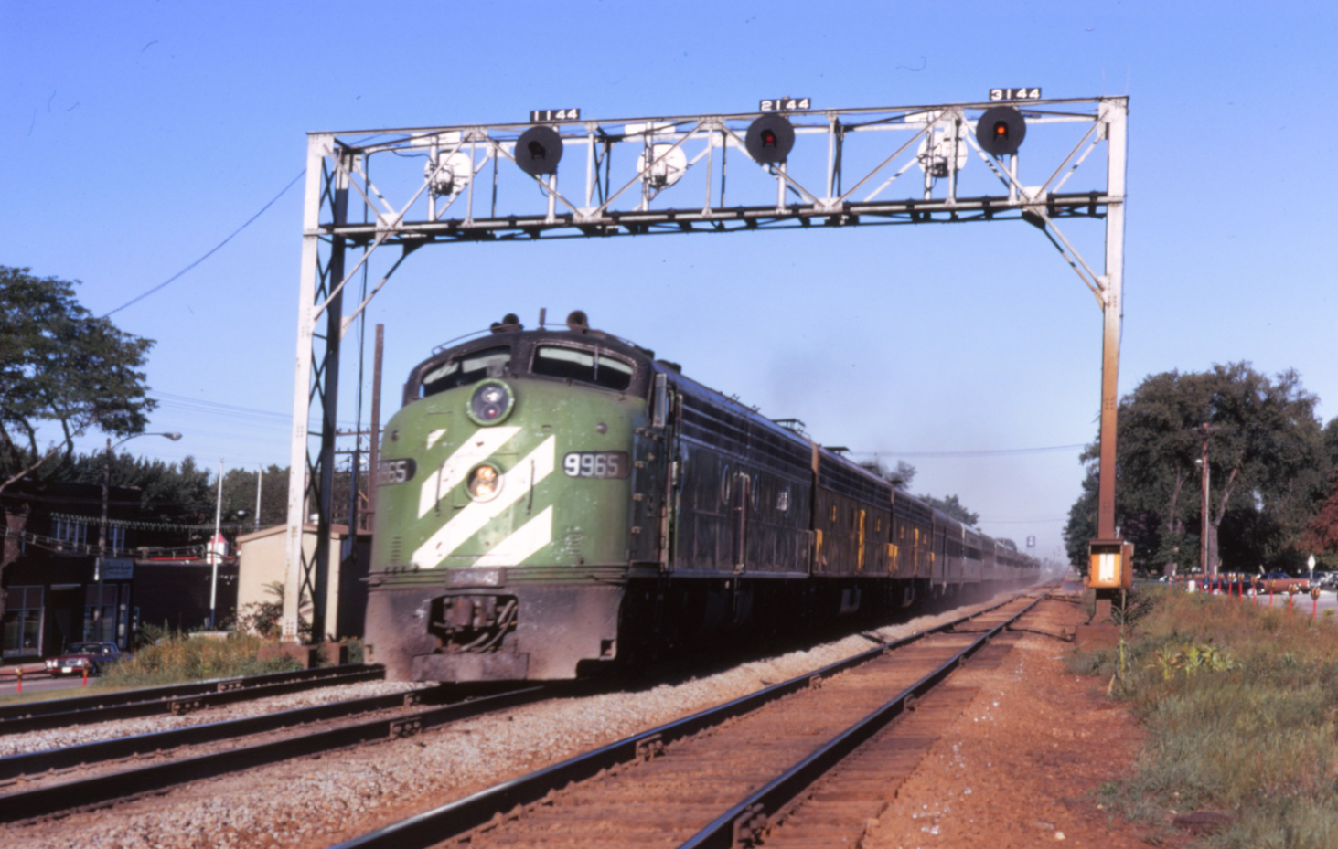 Ex-Burlington Northern #9965 and two other UP E-units roar through Downers Grove, Il1inois on 1 June 1972 with the abbreviated version of the San Francisco Zephyr. (R. Craig photo) |