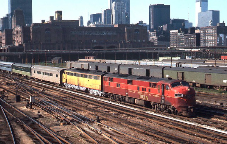 Amtrak avoided purchasing any E-units other than E8/9s. However, this June 1973 photo shows leased GM&O E7A #103A on the point of the morning train leaving Chicago. (Bill Raia photo) |