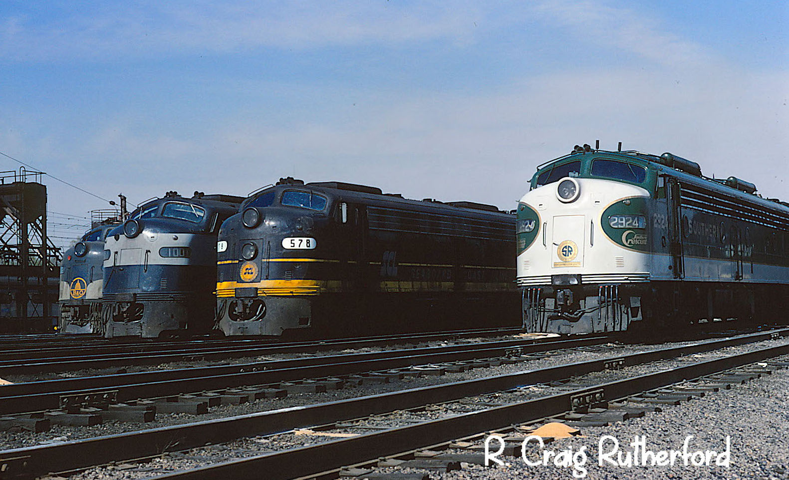 It is April 30, 1971 and four E-units stand ready at the Ivy City engine Terminal in Washinton DC. All of the E's except for the Southern will become Amtrak property the next morning. |