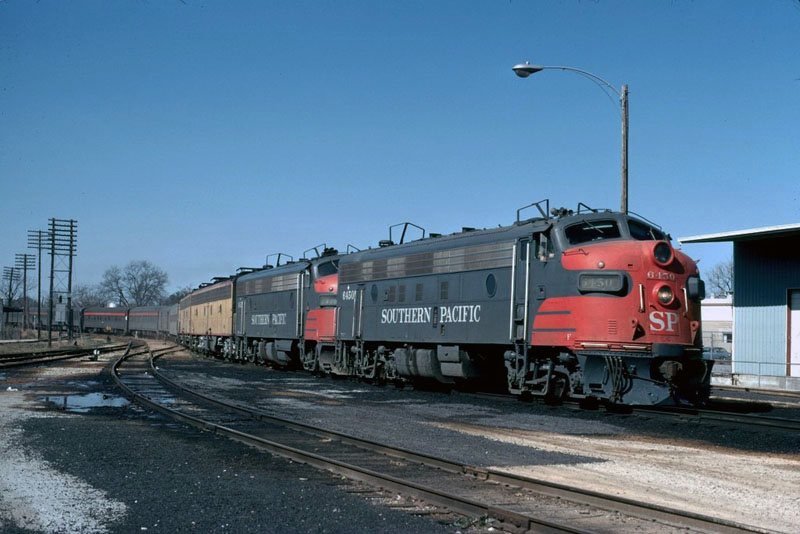 SP FP7s 6450 and 6455 lead two leased UP E-units on Amtrak #2 the eastbound Sunset Limited arriving at the SP Station in Houston, TX on January 25, 1972 close to its scheduled 12:00 Noon arrival time. (Ralph Back photo) |