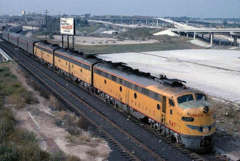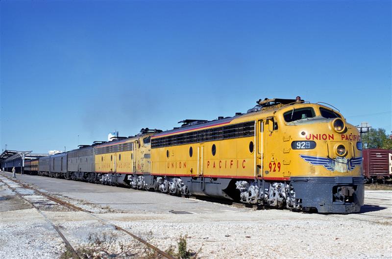 UP E9 947 leads an A-B-A set of leased UP E-units departing from SP's Houston station in Houston, TX on October 31, 1971 with Amtrak’s eastbound Sunset Limited #2. (Ralph Back photo) |