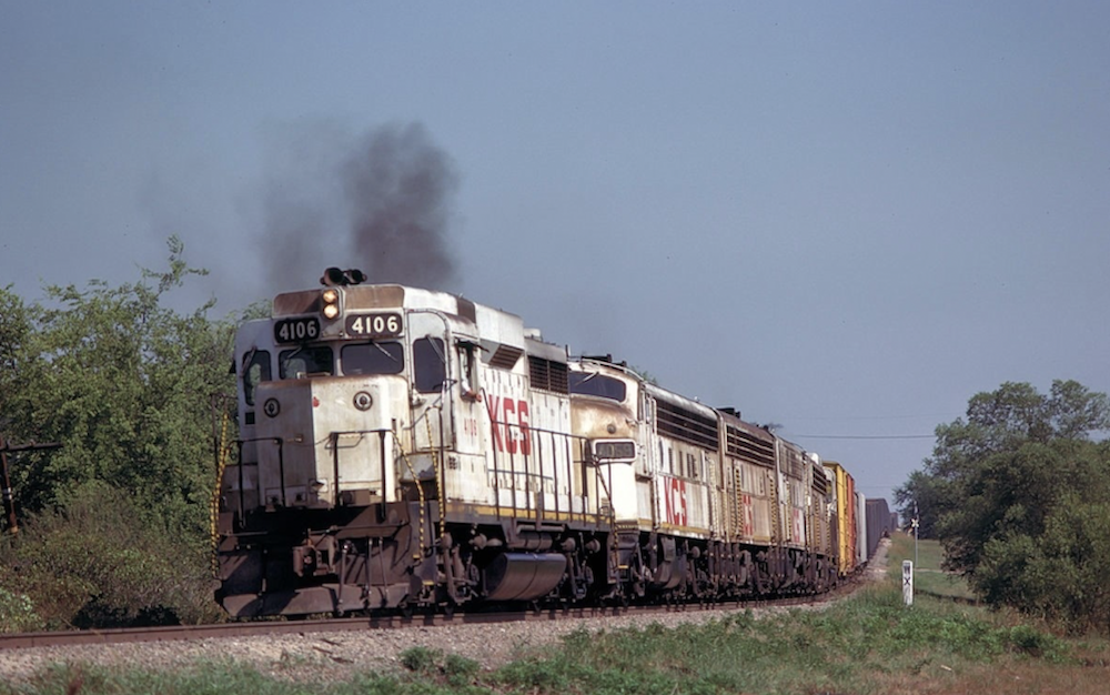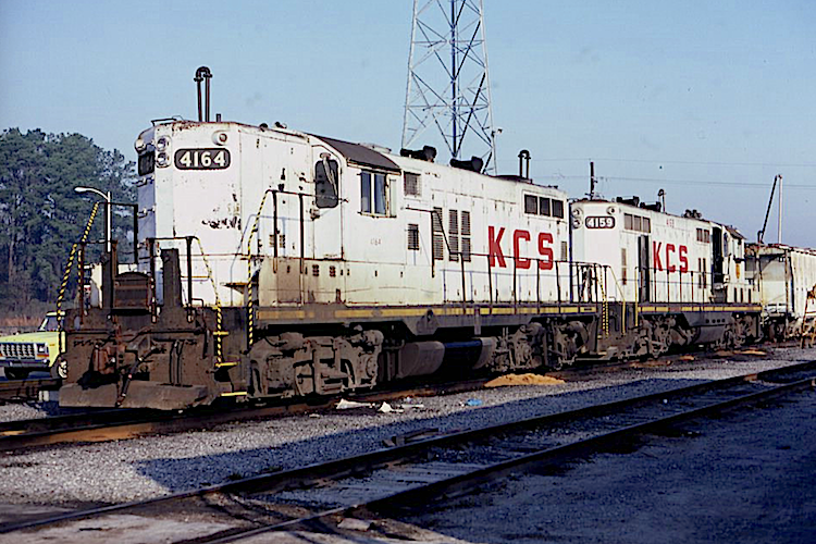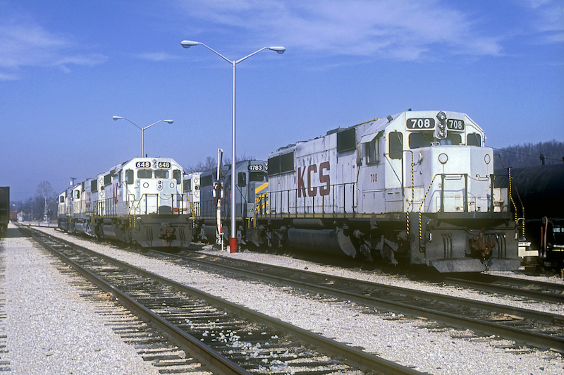 By the early 1950s, the focus at KCS (as with other railroads) had shifted from marketing to operating ratios and cost cutting measures. Economy was the norm; the classy locomotive attire once worn by the railroad's first generation motive power gave way to different single-color schemes with simplified trim. Perhaps the most notable of the economy schemes arrived in 1966 concurrent with the delivery of KCS's first second-generation locomotives. Carbodies and cabs were done in solid white, with a gold frame stripe and a large red "KCS" on the long hood. This "ghostly" attire was replaced several years later by battleship grey with gold-nose chevrons; it was the last of the economy-driven schemes, prior to KCS's retro- looking "Belle" colors of five decades earlier. |