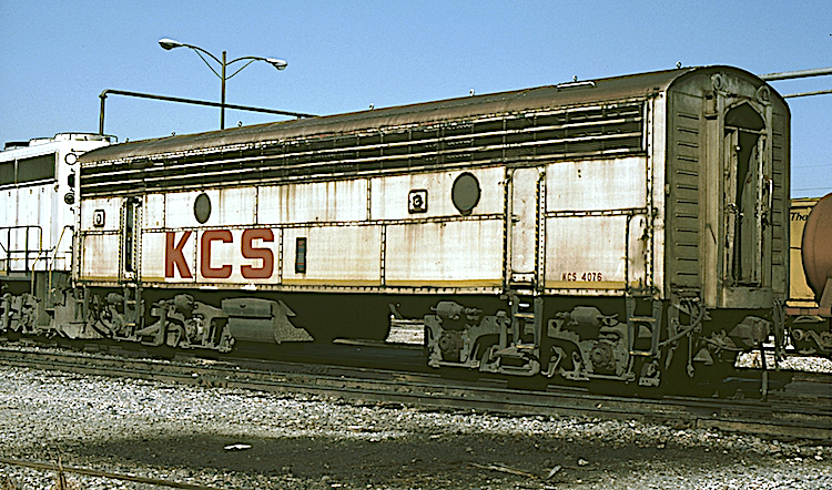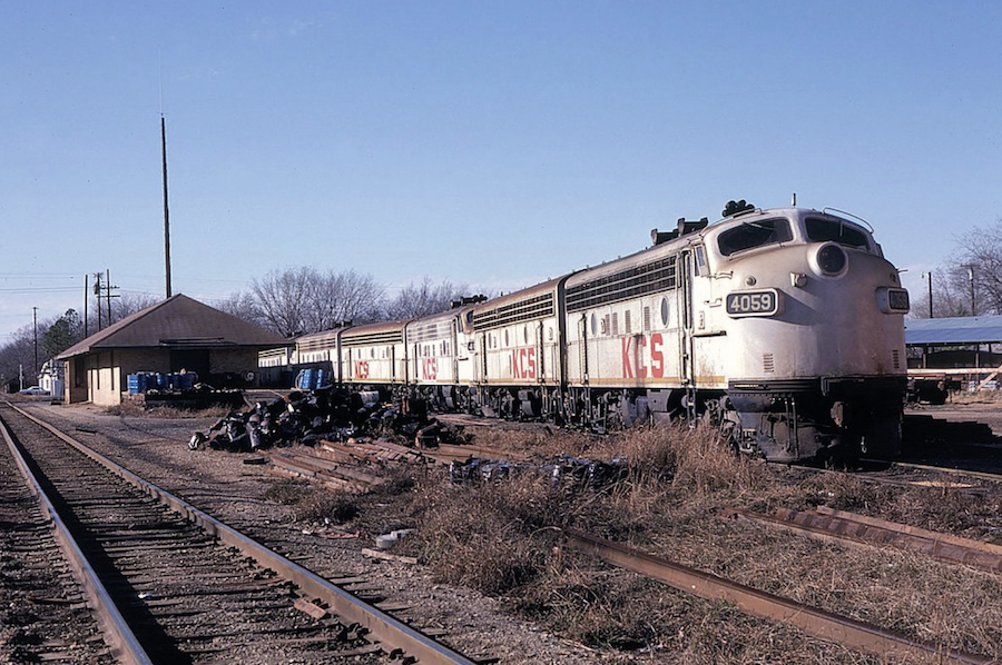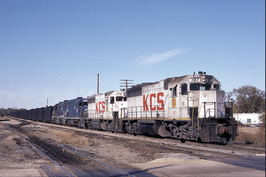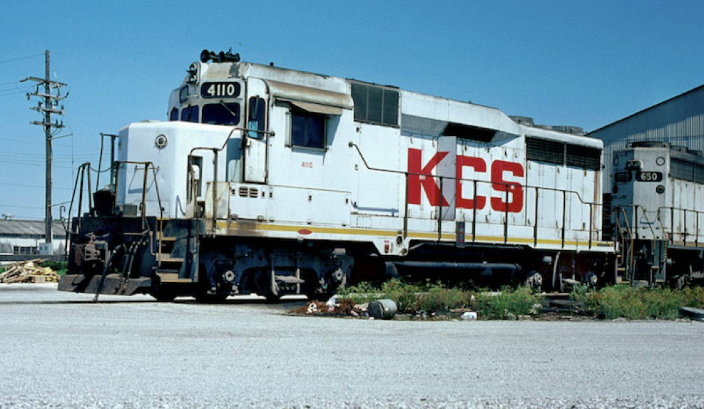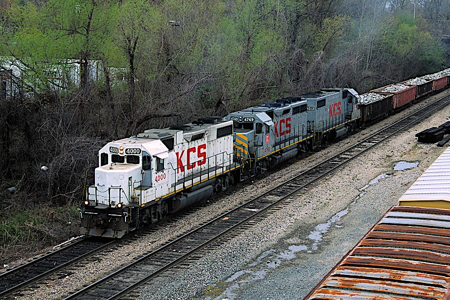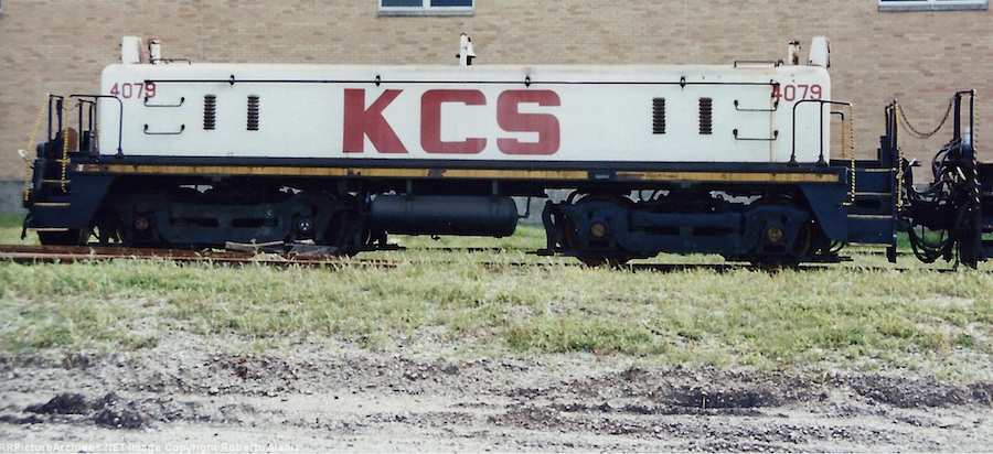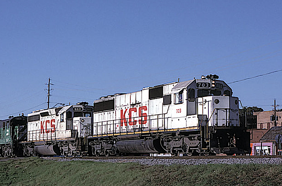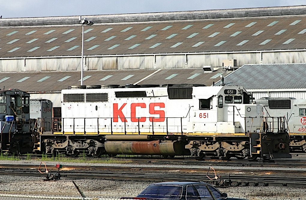 The following information comes from the May 1988 issue of The Crow, the monthly newsletter of the Kansas City Southern Historical Society, which was edited by Lowell McManus: -- NEW LOCOMOTIVE LIVERY? KCS SD40-2 652 has been repainted into the following new experimental paint scheme: The basic color is a medium gray, described by one observer as "not nearly as dark as SP's." The front of the short hood is tiled from top to bottom with yellow chevron stripes, broader than those formerly used by MoPac. The big red "KCS" lettering remains on the side of the long hood, as does the yellow stripe along the side of the frame. The trucks and fuel tank are black. The number is in red below the cab window, and the octagon herald is absent from the locomotive. The repainted unit, called The Gray Ghost by some employees, is now in regular use." The Crow also reported in December 1988: A NEW, IMPROVED WHITE. KCSHS member Louis Marre (coauthor of Diesel Spotter's Guide Update) sends us the following astute observations on the current state of KCS color schemes: "...they are painting at a fairly steady rate, and in the current variant of the white scheme. The sharp-eyed will note that the color is changed slightly, and the painting method is much altered: now the acrylic 'pearl gray' is applied, then the red stencils, and then a clear overcoat is added, making washing much more effective. An additional carwash-type facility has been added...in Shreveport, and units are being hand washed on a regular basis at Neosho and Heavener as well. All this means that the white scheme should hold up better and look better while on the road if this whole program is followed." We have independent reports that GP38-2 4006 was painted in the experimental dark gray solely to exhaust the existing supply of the expensive gray paint. The new acrylic painting process was apparently pioneered on gray SD40-2 652, and the employees who work with it and wash it regularly in Neosho are highly impressed with its durability. The new white should be as good. Other reference sources: Extra 2200 South (April/May/June 1991 issue) and KCS Roster (2003) compiled by F.L. (Dutch) Schultz, jr. Additional data provided by Paul F. De Luca, Steve Gerbracht, David Hawkins, Zack Hilton, Bryan Jones, and David W. Read.