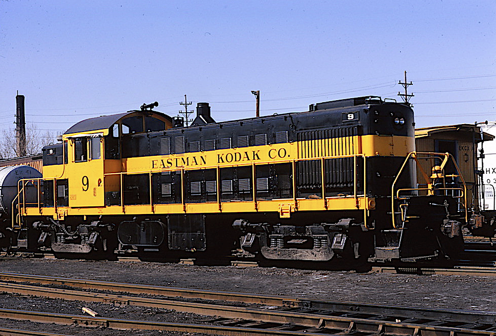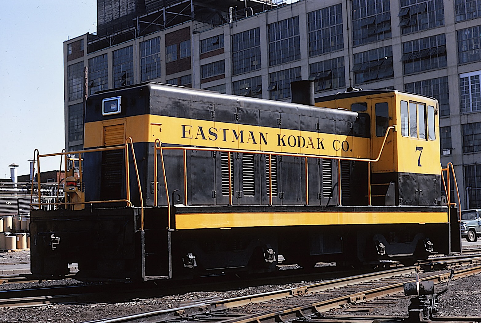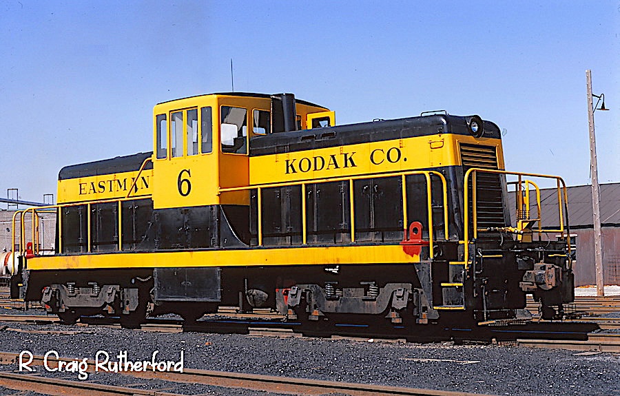 Our host graciously gave us a tour of the Kodak Park railroad, with occasional stops to photograph their GEs #6 and 7 (80 and 70-toners respectively), as well as Alco #9 (RS1). A Visit to the their shops and paint-spray booth netted a shot of 4-year-old EMD #8 (SW1000) which was getting a fresh coat of black and Kodak yellow. | |