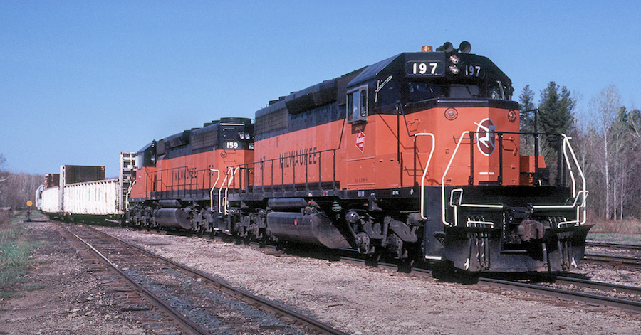 Milwaukee Road 197 makes a set-out at Trout Lake, Michigan on 8 May 1985 (Chuck Schwesinger photo)
