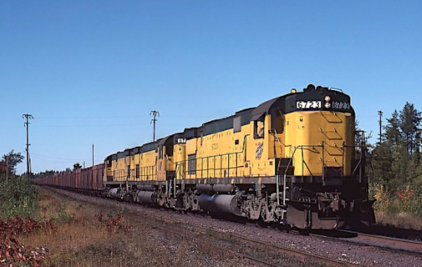 ![]() Chicago & North Western tied up nearly all their ore moves from Escanaba at Euclid Yard in Ishpeming until summer of 1986, when the interchange was moved to Eagle Mills, Queens and Partridge. C&NW H16-66 #1678 at Euclid Yard on Date xxxxx wears an economy paint scheme. (Robert C. Anderson photo; R.Craig collection) | ![]() The closure of Republic and Humboldt processing plants resulted in hardly any ore being interchanged at Euclid, and all that remained was the general freight. Thus, C&NW often made turns from Escanaba to Empire. C&NW C628 #6723 rolls through Little Lake, Michigan on 30 September 1979. (Chuck Schwesinger photo) |