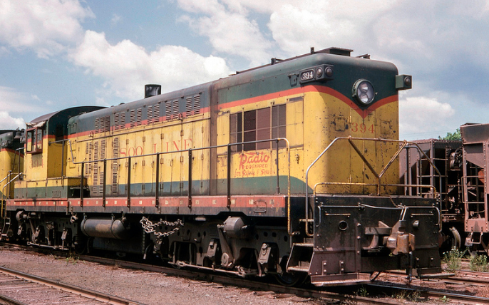 ![]() SOO Line Baldwin #394 still wears the colors of 1961-merger partner Duluth South Shore & Atlantic. The six-axle AS-616 was typically assigned to shove loaded jennies up the 1.22 percent incline of the railroad's 3,500-foot-long ore dock at the Marquette Lower Harbor. (Karl Henkels photo 10 July 1966; Chuck Schwesinger collection) | ![]() DSSA's four (#300-303) could be best described in a single word - "Brutes." They were 74 feet in length and tipped the scales 360,000 pounds. At merger time in 1961, the quartet were coneyed to the SOO line as #396-399, but only the #397 received the red and white livery. (Karl Henkel photo; Chuck Schwesinger collection) |