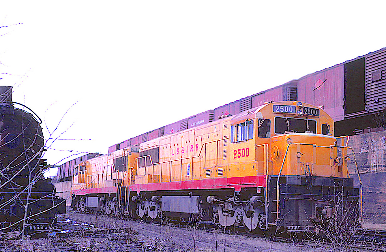![]() General Electric-built U25Cs #2500 & 2501 were the first non-Alco diesesls acquired by the Lake Superior & Ishpeming railway; their yellow with red lettering garb was also non-standard. The pair were parked next to the ore dock approach ramp at Presque Isle on 10 April 1977. The 2-8-0 steamer #19 belonged to Marquette & Huron Mountain, a defunct tourist line. (R. Craig photo) | ![]() Railfan interest in the LS&I rose aubstantially with the arrival of the "2400" series RSD15s. The long-nose "alligators," were right-at-home on the point of 120-car iron-ore trains. On 18 May 1984, the #2400, 2405 and 2401, work the "Yard Job" before grabbing a string of general freight cars and heading for the C&NW / SOO at Ishpeming. (Chuck Schwesinger photo) |