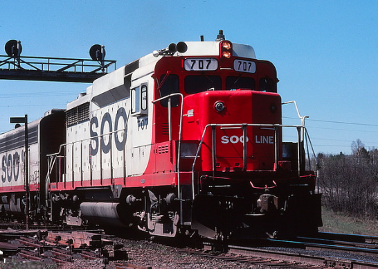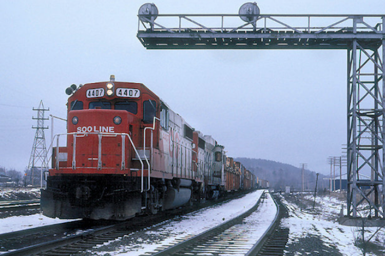 ![]() SOO Line GP30 #707 and F7A #213A duck beneath the signal bridge at the east end of Euclid Yard in Ishpeming and head for Marquette, 15 miles in the distance. The EMD-built duo lead an eastbound mixed manifest from L'Anse to Marquette. After making set-outs and pick-ups, the daily (except Sunday) train continues its runs towards Gladstone. (R. Craig photo 4 May 1979.) | ![]() SOO 4407 and GP30 have struggled up the west grade from Marquette with 15 cars on wet rail; it holds at Negaunee for an e/b C&NW ore load out of Euclid Yard. By October of 1987, a newly formed Wisconsin Central Ltd. takes ownership of this segment of the SOO, along with its entire Lake States Transportation subsidiary (Chuck Schwesinger photo, 14 April 1980) |