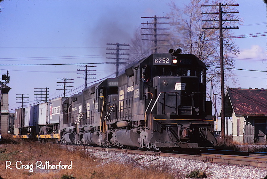 PC SD40 #6252 leads a hot E/B intermodal train pass the tower at Upper Sandusky, Ohio on 24 January 1974