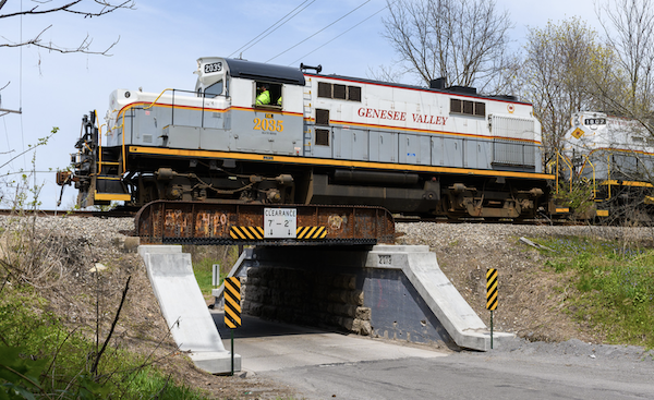 While working on Falls River Railroad, GVT #2035 leads a westbound local. (Joseph Cermak photo at Albion, New York on 6 May 2020). | Roberval & Saquenay