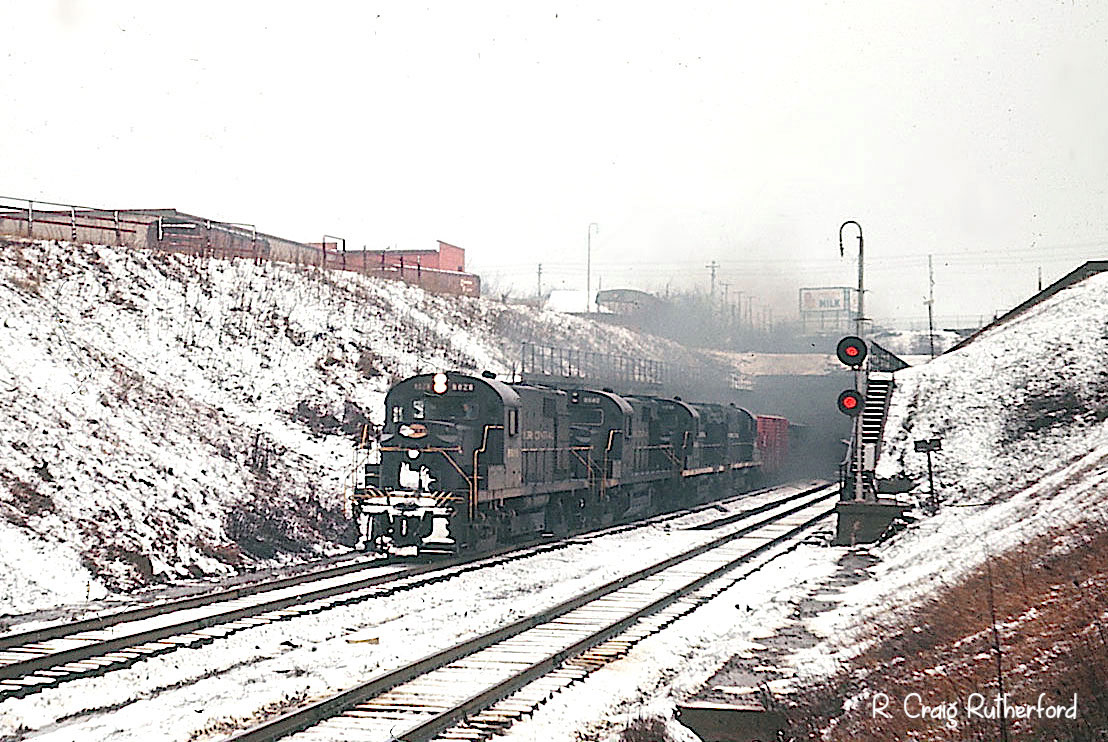 ![]() A cloud of oily black smoke accompanies a quartet of NYC RS32s as they blast out of the Detroit River Tunnel and begin a race across Canada in February 1964. |