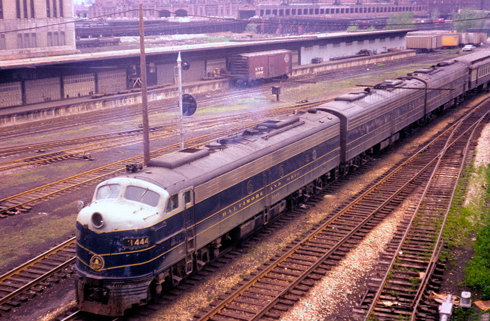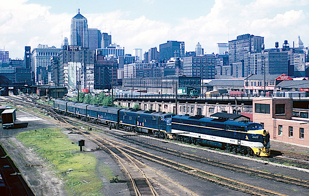 ![]() Atchison Topeka & Santa Fe's "Texas Chief" (Train 15) got a lot of attention prior to its late afternoon departure from Dearborn Station on 18 June 1967. Newly delivered U28CGs would be a common sight on the Chicago to Houston service. (Ted Ellis photo). | ![]() Given the classic set of E8A-B-A power and matched blue/gray/black corporate attire, this Marty Bernard photograph appears to show Baltimore & Ohio's "Capitol Limited" (Train #5) arriving at Grand Central Station on a May morning in 1964. |