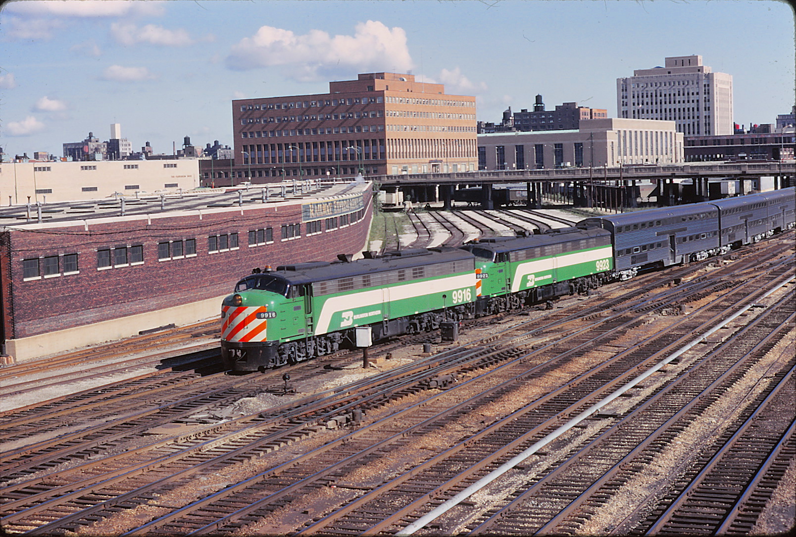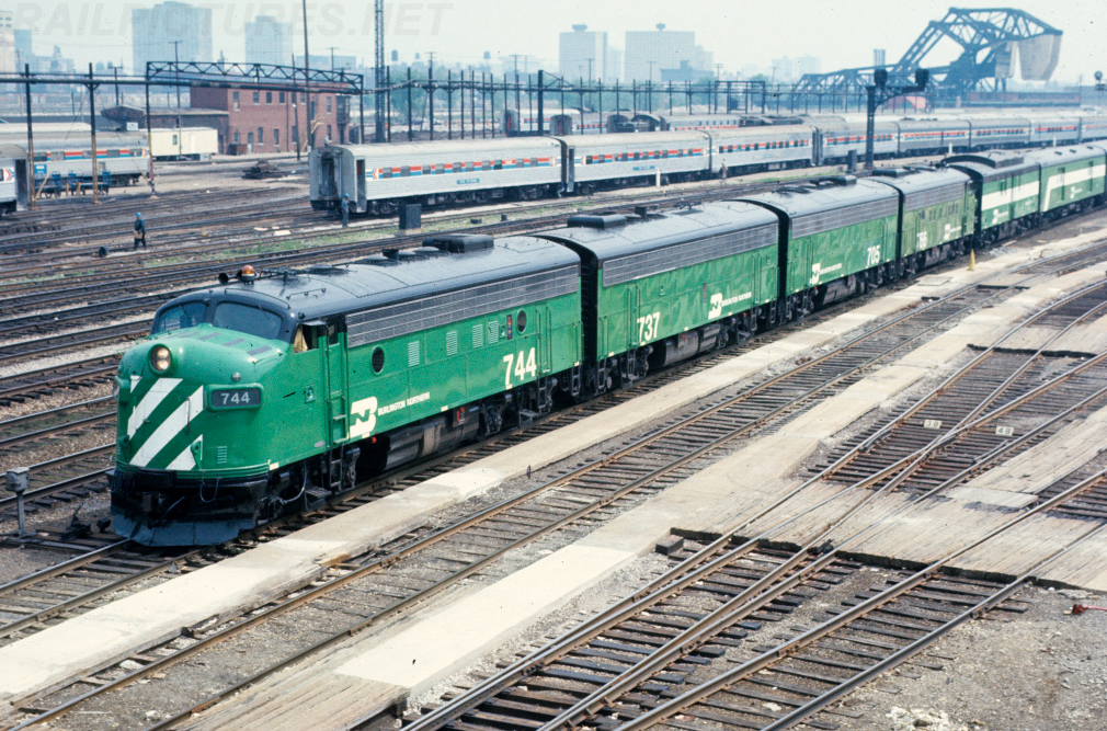 ![]() | ![]() By the mid-1970s, very few railroads serving Chicago used F-units in passenger service, and the Burlington Northern was not an exception. A rare officer special with a neat-looking set of A-B-B-A F-units arrives at Union Station on 14 May 1977. (Don Crimmin photo). |