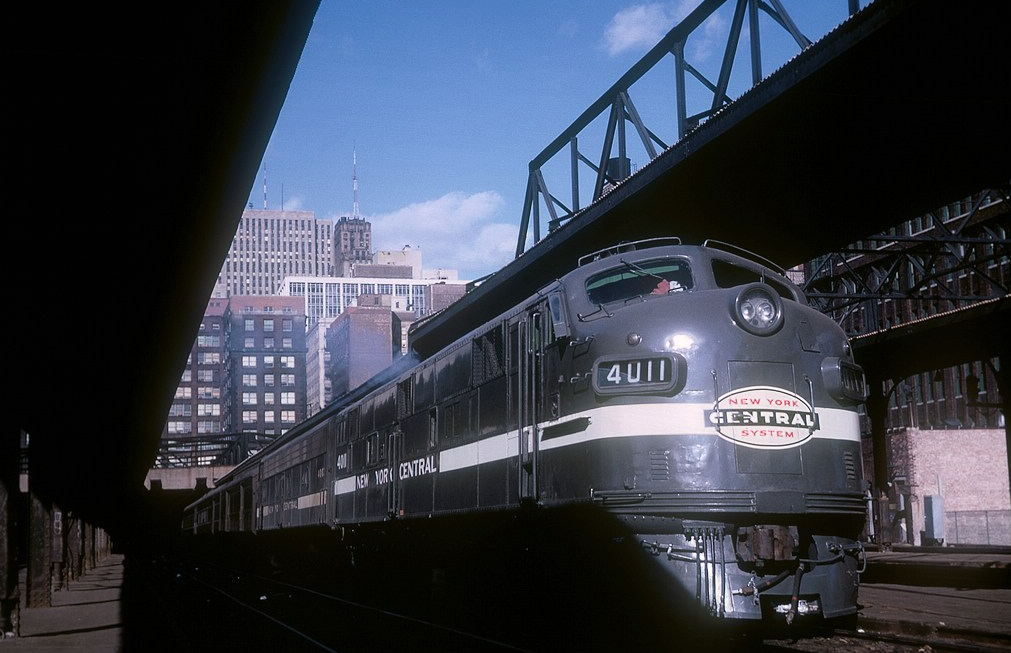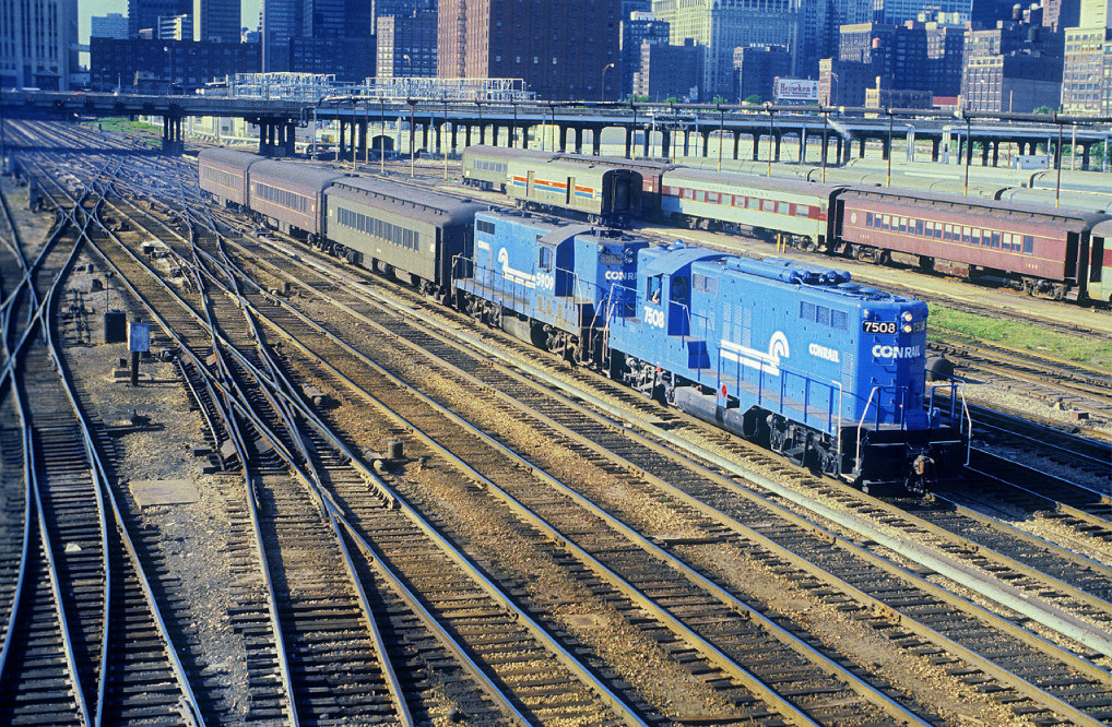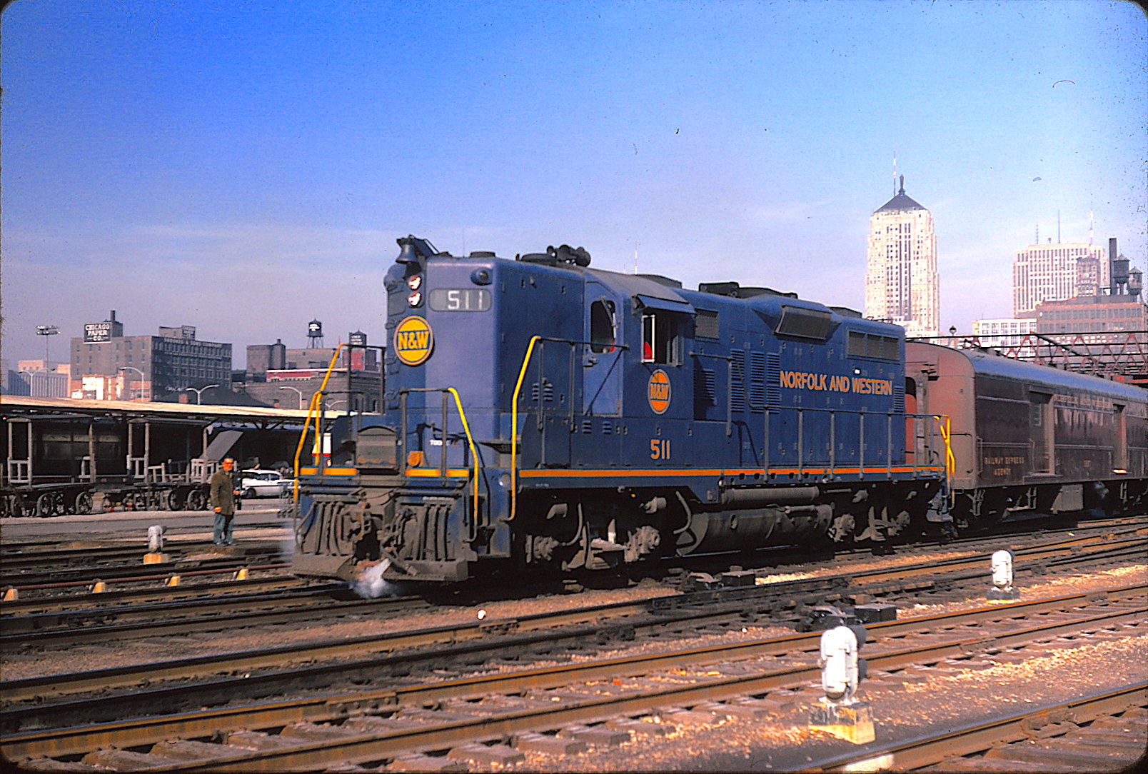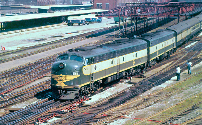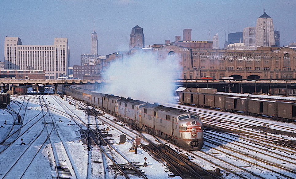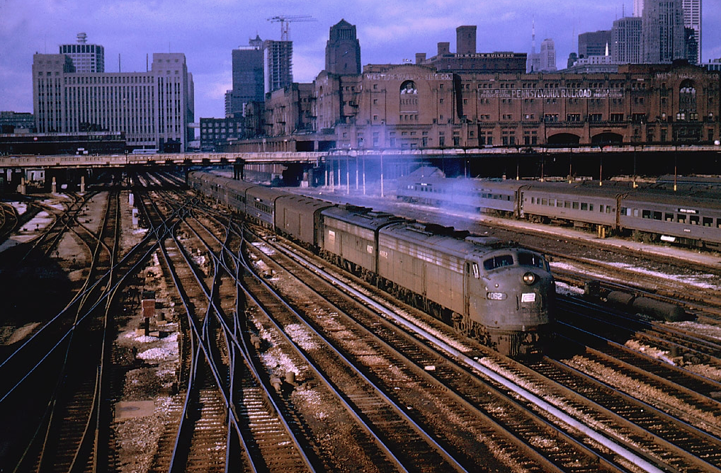 ![]() Two years after the N&W + NKP + Wabash merger, N&W passenger GP9 #511, wearing the railroad's new corporate "Pevler" blue livery, departs Dearborn Station on 12 November 1966 with a short commuter train to Orland Park. Prior to the merger, the passenger units wore an attractive tuscan red. (Owen Leander photo) | ![]() Few railroads benefitted from the creation of Amtrak as much as did the Penn Central; the cost of hauling passengers was an added burden to the railroad's already poor financial health. The afternoon of 31 October 1970 sees PC's "New England States" (train 28) depart Union Station with two E8As leading the way towards New York. (George Hamlin photo). |