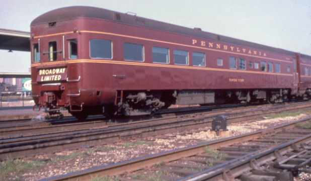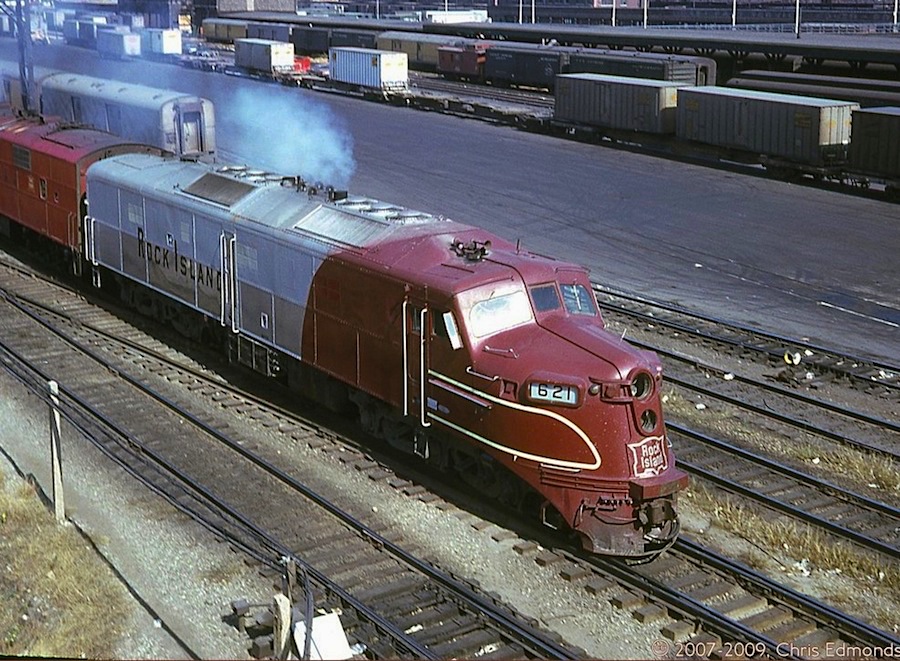 ![]() Pennsylvania RR's "Tower View" observation car carries the markers for the railroad's flagship "The Broadway Limited." The tuscan red and gold-striped streamliner makes an impressive sight as it departs Chicago's Union Station on its journey to New York City in July 1966. (Photographer unknown / Cale Leiphart collection) | ![]() Rock Island #621, one of the oldest mainline diesel road locos in all Chicagoland, had been re-engined by EMD with a 16-567 powerplant, and interestingly it still emitted clouds of exhaust - but they were blue, not black. Photographer Chris Edmonds caught the Alco leaving LaSalle Station. |