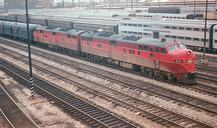 ![]() The only international trains to call on Chicago were Grand Trunk Western's "LaSalle" (trains #5 & 6). The eastbound is shown here departing Dearborn Station and headed towards Montreal on the morning of 13 May 1964. (Roger Puta photo / Marty Bernard collection). | ![]() Gulf Mobile & Ohio's northbound "Midnight Special" slowly approaches LaSalle Street Station on the morning of 13 May 1964. E7As #101 and 101A, which were built by EMD in 1945 delivered the train from St. Louis. GM&O began replacing mainline steam power at the end of World War II. (Marty Bernard photo) |