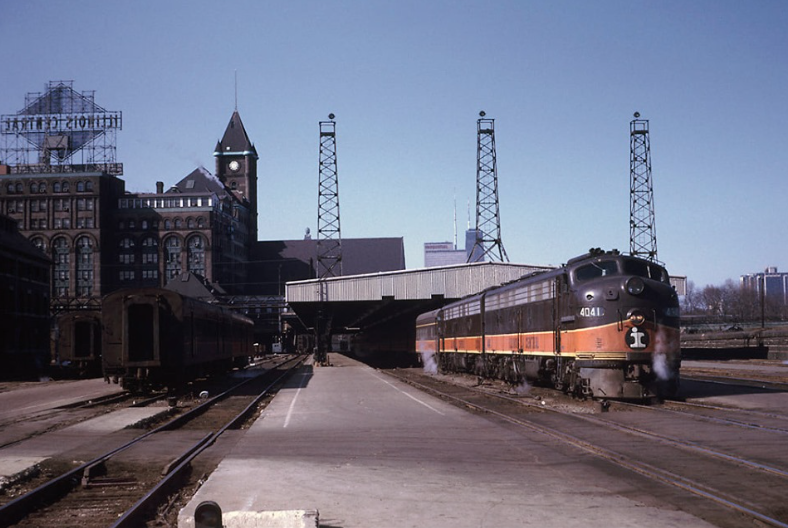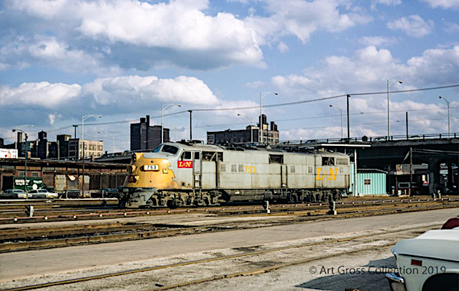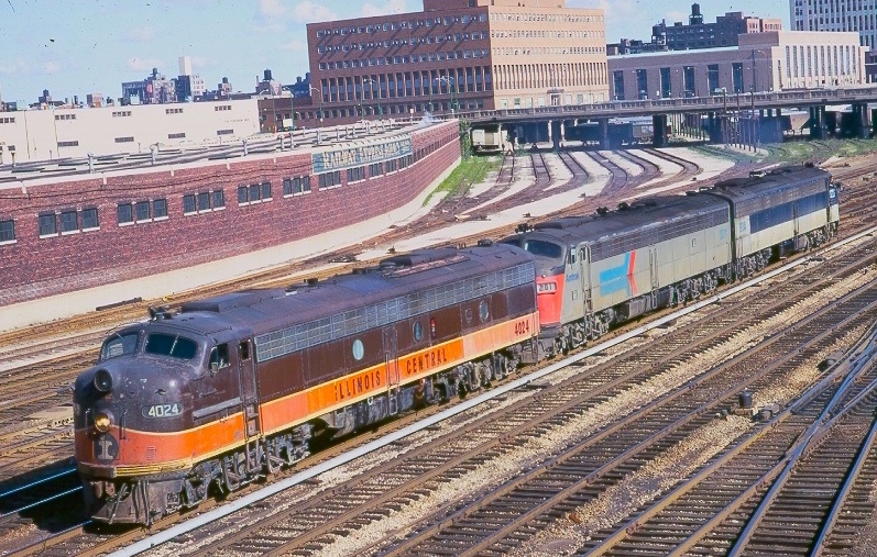 ![]() Illinois Central's large Romanesque-style terminal stood at the intersection of Roosevelt Road and Michigan. This George Hamlin photo from 9 April 1971 shows IC train #5, the "Panama Limited" with E9A #4041 in the lead, waiting for its late afternoon departure time. | ![]() With the 1969 purchase of C&EIs Evansville line, the Louisville & Nashville also gained responsibility for running "The Danville Flyer" (Trains 3 & 4) between Chicago and Danville. L&N E6A #753 will lead the train south in April 1970. (Photographer unknown, Art Gross collection). |
