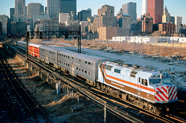 ![]() Rock Island's "Golden State" (in partnership with Southern Pacific) arrives at LaSalle Street Station with both Rock and SP power. The gray and red E8A #6051 now resides at the California Railroad Museum and wears the famous "daylight" colors. (Ted Ellis Photo) | ![]() Seconds before ducking under the Roosevelt Bridge on a March day in 1980, RTA F40PH #107 handles an afternoon commuter run on the old Rock Island district. (Chuck Zeiler photo) |