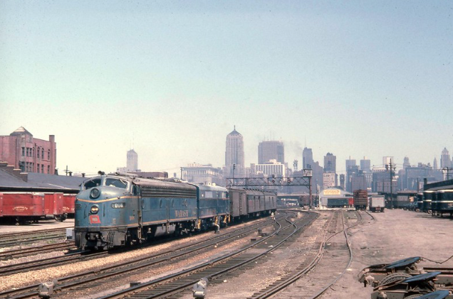 ![]() The engineer of ACL 524 backs the "Southwind" (Train #xx) consist into Union Station circa 1960. The every other day Florida-bound train was jointly operated by the Pennsy, Louisville & Nashville and Florida East Coast railroads. (Tom Bedwell photo) | ![]() "Banner Blue" Wabash railroad's flagship train, departs Dearborn Station on 30 May 1963. Roosevelt Road fades in the background as Train #11 heads for St. Louis; it is led by EMD E8A #1008 and a PA1 from competitor Alco. (James J. Buckley photo, D.W. Davidson collection) |