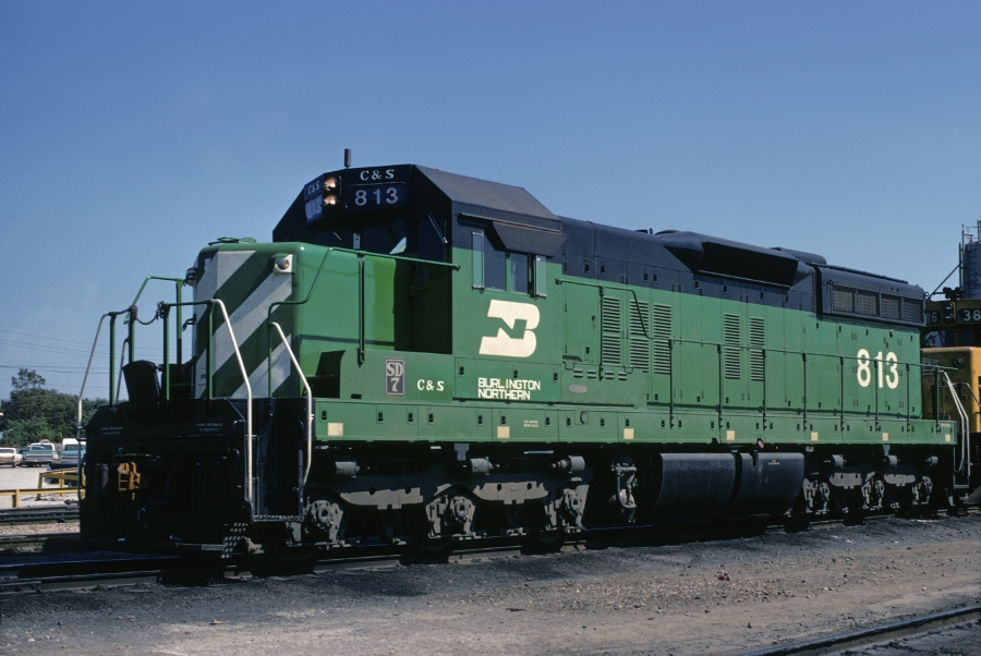 C&S SD7 #815 (sans script slogans) idles at HB&T's Milby Street Locomotive Facility in Houston, TX. C&S 815 never received the CB&Q Chinese-red scheme before repainting into BN Cascade-green. Ralph Back photo 25 September 1971 | Colorado & Southern