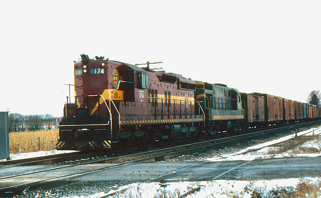 It was a rather remarkable locomotive combination that hauled Canadian National hotshot #492 through Bowmanville, Ontario on 27 December 1966. Up front was a six-axle leaser from DMIR SD9 #174; the trailing unit #2201 was one of CNR's remaining FM-designed (CLC-built) H16-44s. (Doug Hately photo) |